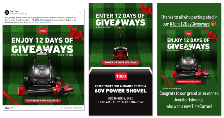 We’ve seen tremendous success through the use of e-mail, organic social media and content creator tactics in the past and knew that we would see similar results for the 12 Days of Giveaways campaign. We used e-mail and organic social media to target existing Toro customers and consumers who like the Toro brand, and we used content creators to expand our reach to a broader audience that we weren’t able to reach organically.