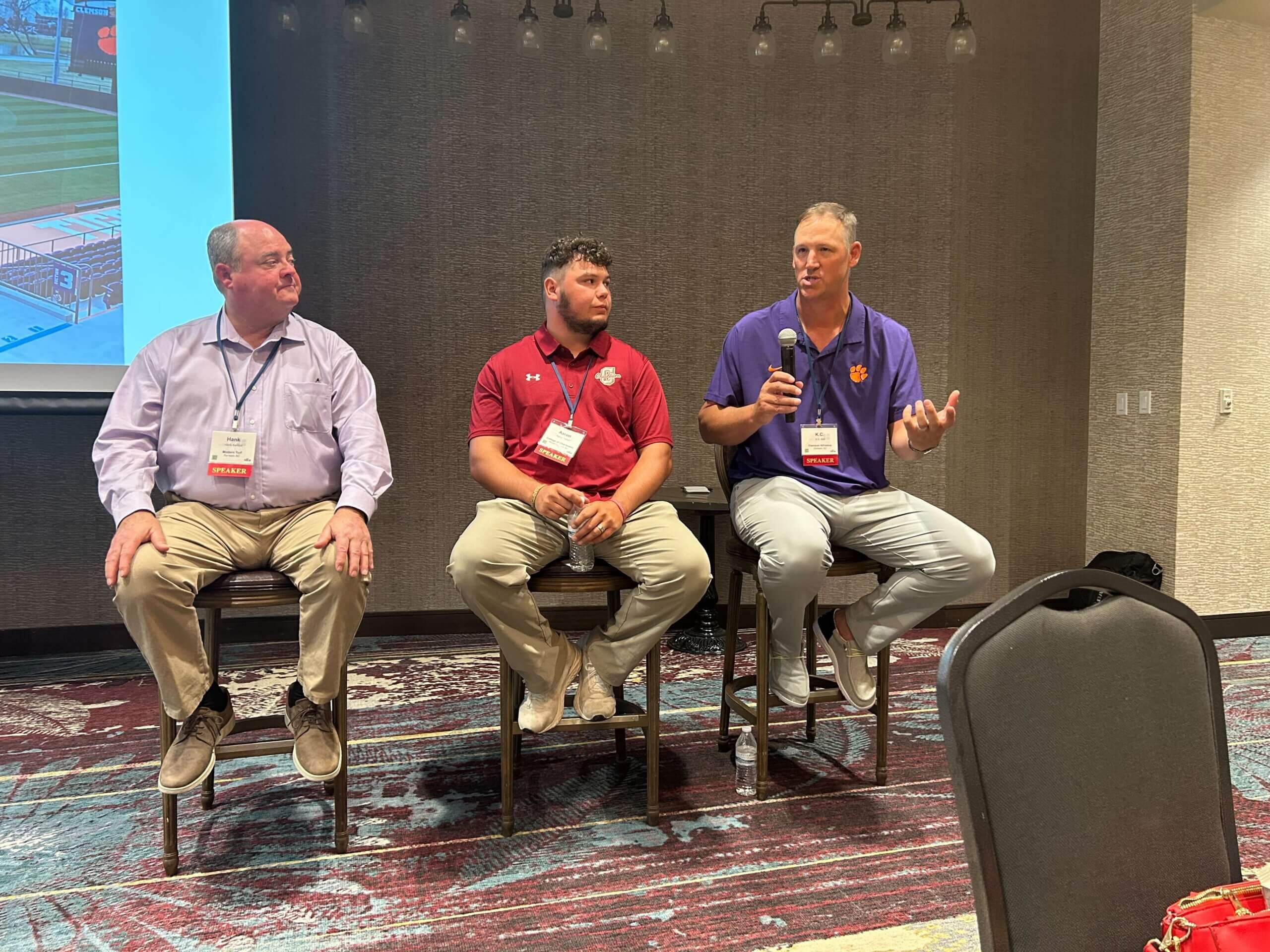 The discussion began with introductions, followed by moderator-led questions and an open Q&A. Panelists included Hank Kerfoot, president and founder of Modern Turf, Aaron Tipton, grounds supervisor for the College of Charleston, and K.C. Bell, senior director of athletic grounds at Clemson University. Each shared a unique professional journey and gave context to how turf decisions are shaped by everything from research and technology to budgets and event schedules.